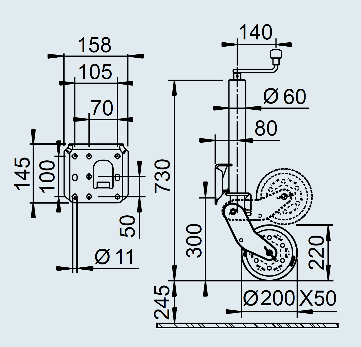 | Riteņa izmērs | 200 x 50 mm |